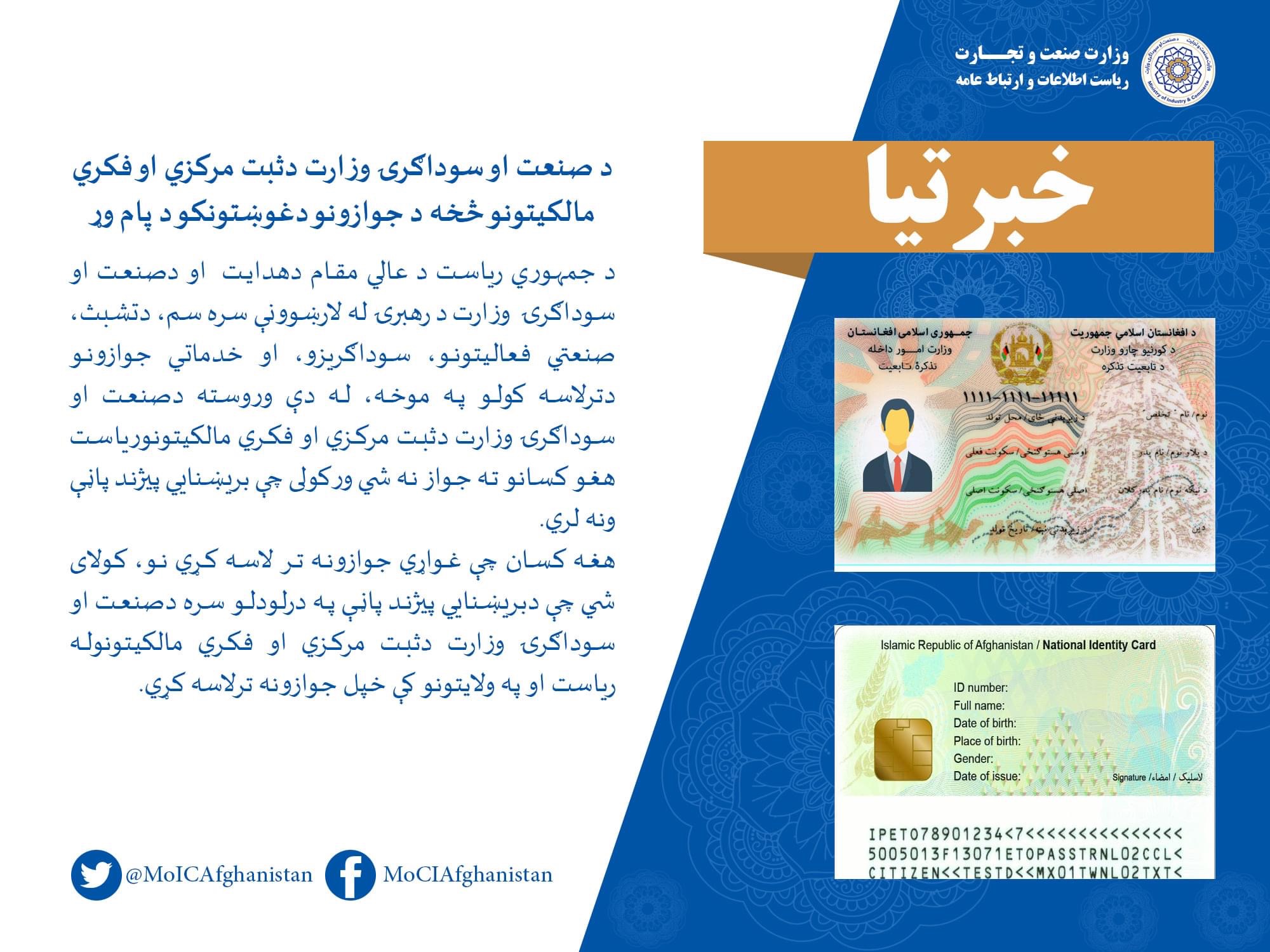د جمهوري ریاست د عالي مقام دهدایت او دصنعت او سوداګرۍ وزارت د رهبرۍ له لارښوونې سره سم ، دتشبث ، صنعتي فعالیتونو ، سوداګریزو،او خدماتي جوازونو دترلاسه کولو په موخه ، له دې وروسته دصنعت او سوداګرۍ وزارت دثبت مرکزي او فکري مالکیتونوریاست هغو کسانو ته جواز نه شي ورکولی چې بریښنایي پیژند پاڼې ونه لري